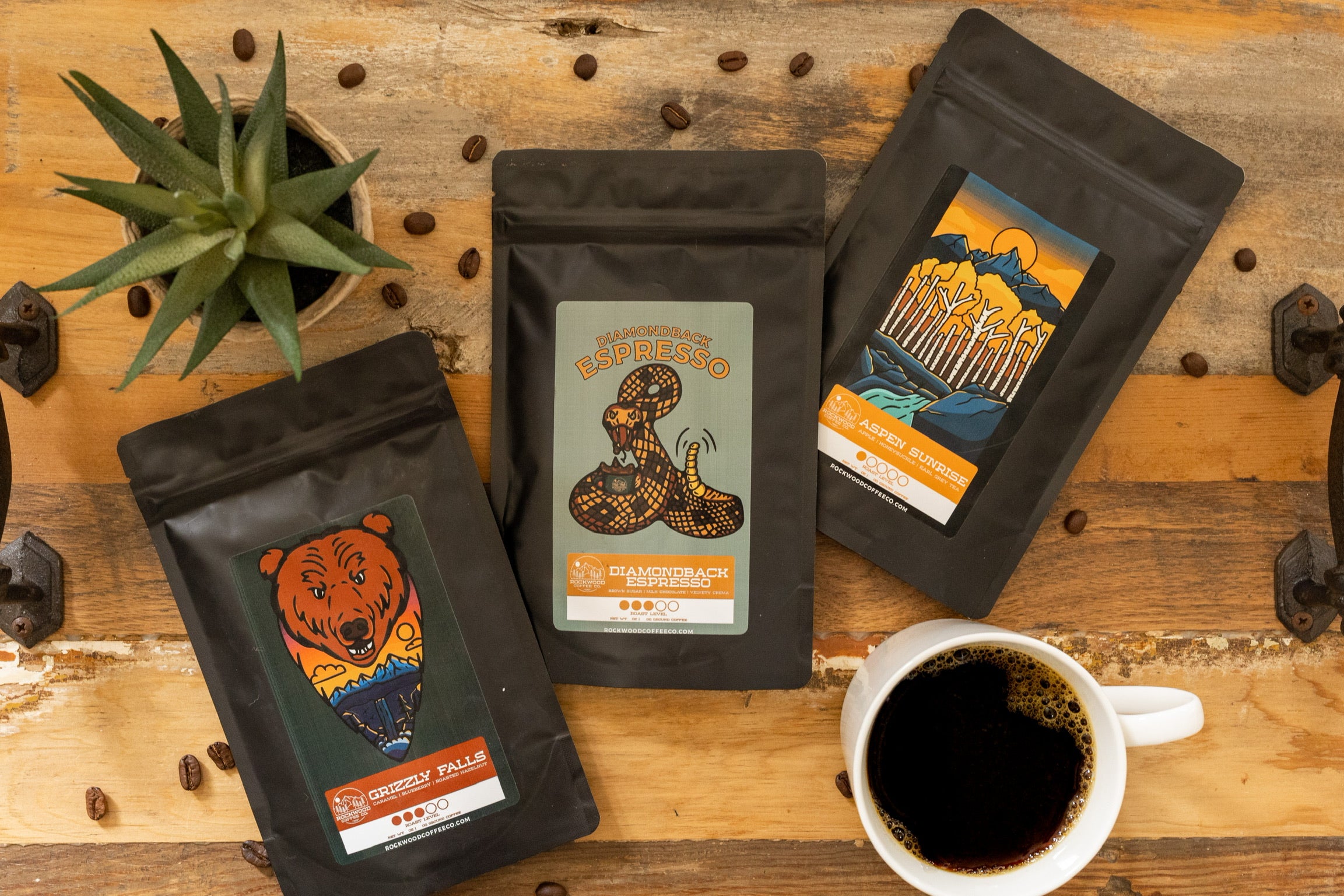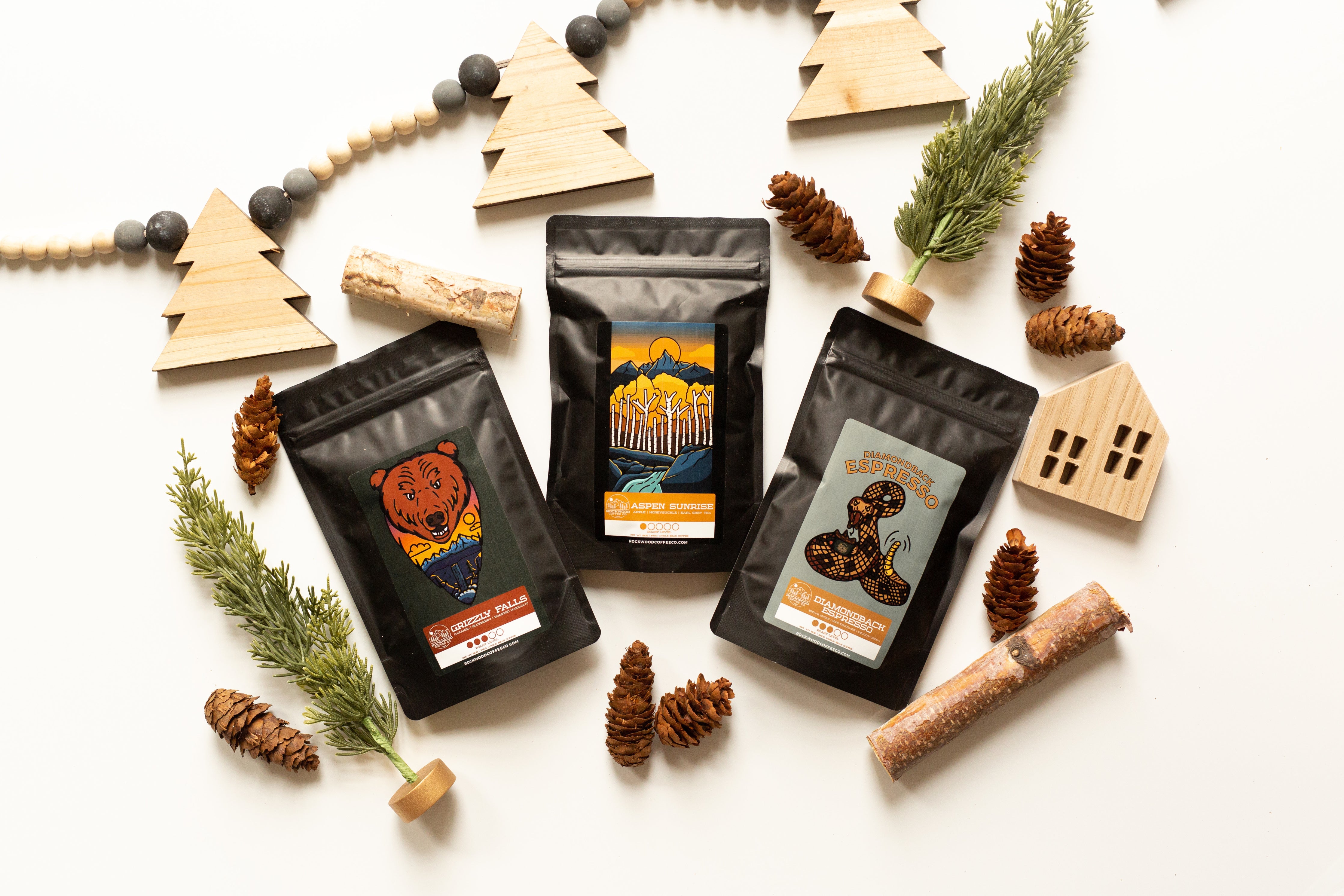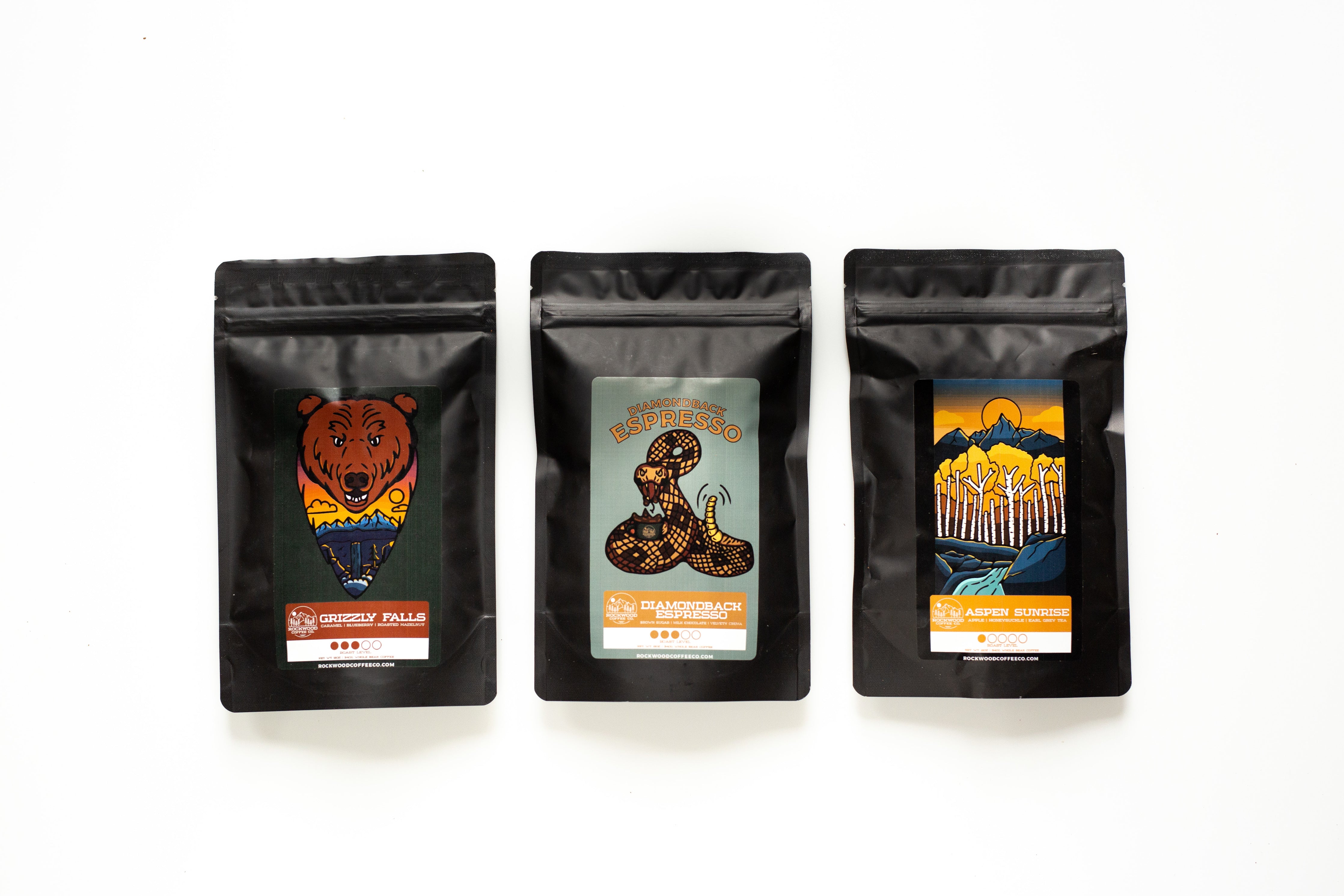 This sampler includes a 3 ounce bag of each of our popular House Blends: Grizzly Falls, Diamondback Espresso, and Aspen Sunrise. Each blend is 100% Arabica, specialty grade, and small-batch roasted.